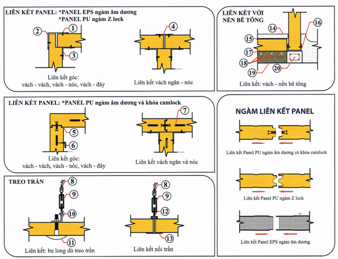 - Liên kết Panel PU bằng ngàm âm dương và khóa camlock (Bằng nhựa APS - POM, gia công cường lực có độ bền cao lên tới 15 năm).