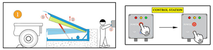 B1: Bấm nút “POWER” để mở nguồn, sau đó bấm và giữ nút “UP” như hình vẽ cho đến khi sàn nâng lên hết hành trình, tấm mũi (Lip) sẽ tự động bật ra.
